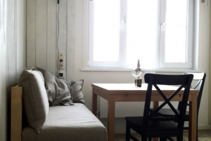 Кухня на контрасте: ретро - уголок с диванчиком (подушки и шторка натуральный лён) и столом,а напротив современная глянцевая минималистическая по отделкам кухня.