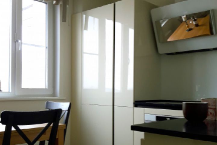 Кухня с глянцевым фасадом увеличивает пространство и отражает свет от окна.