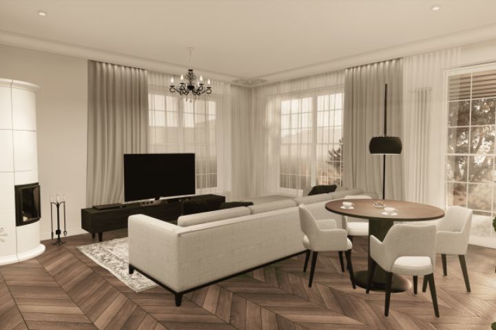 Гостиная-столовая в стиле минимализм с элементами классики. Электрокамин и лепной потолочный карниз создают особый уют при этом не нагружая интерьер. Стеллаж с подсветкой для выращивания цветов является лаконичным предметом декора и местом притяжения взгляда.