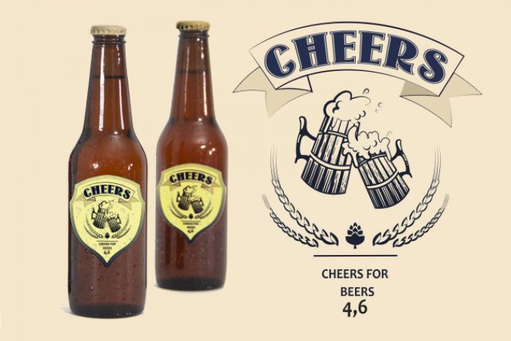 Образец этикетки для марки крафтового пива "Cheers". По просьбе заказчика был выбран традиционный дизайн в винтажном стиле, поскольку продукт пердназначен для более консервативной целевой аудитории. Логотип также разработан мной,представляет собой две старинные пивные кружки, которыми люди бьются, произнося тост (Cheers!). Этикетка украшена стилизованными ростками пшеницы и шишкой хмеля. Выбран готический шрифт для названия марки и полужирный гротеск для надписи внизу.