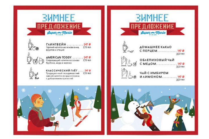 Пиццерии «СуперМарио» потребовалось оформить предложение горячих зимних напитков: для детей и взрослых. Мы нарисовали иллюстрации, придумали иконки, леттеринг, сверстали и подготовили к печати.