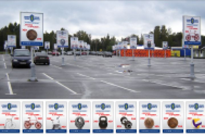 110 постеров, все они указывают в направлении фитнес-клуба. Стоянка ТК Гарден-сити. 2009г.