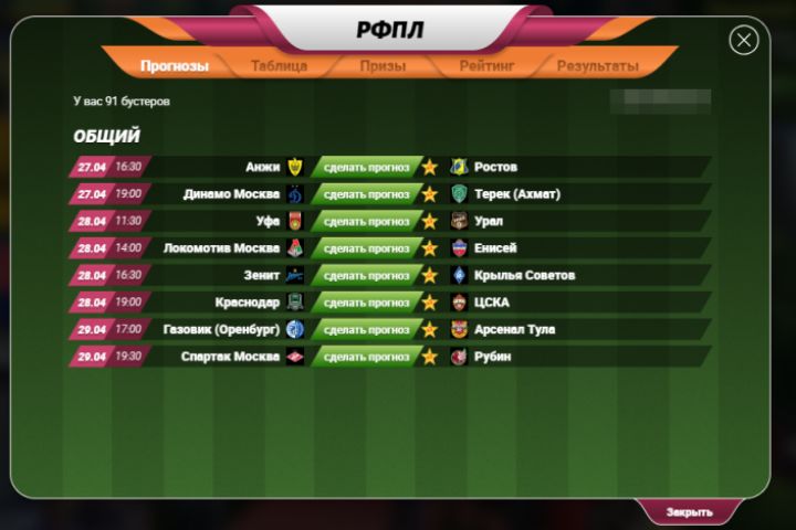 Данные о матчах в лигах обновляются постоянно через платный источник. Как только матч проходит пользователю начисляются очки согласно его ставке. На сайте ведется различные рейтинги и проводятся конкурсы. Разработана партнерская программа. Также есть система поощрения – к примеру за репост пользователь получает бустеры. Бустер – возможность удвоить свою угаданную ставку.