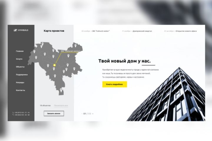 Справа вверху "новостная лента", точный оффер с переходом на подробную информацию, карта с проектами,