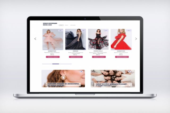 Работа выполнена в Adobe XD. Сайт посвящен продаже женской одежды. В данной работе можно увидеть, как сайт будет смотреться на разном устройстве (компьютера планшете и телефоне) .