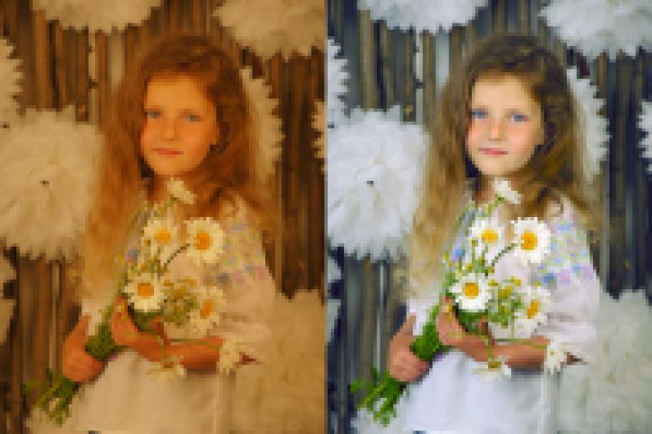 цветокоррекция, ретушь лица (не глубокая).