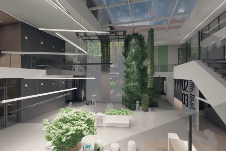На площади 380 м2 расположены выставка студенческих работ, медиаэкран, сцена, вертикальное озеленение, стойка информации и рекреация.