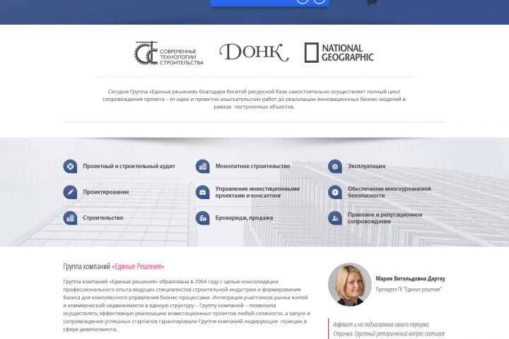 Перед нами стояла задача — создать современный и достойный сайт-визитку для крупной строительной компании «Единые Решения» из Санкт-Петербурга. Основная цель — подчеркнуть масштаб и надежность компании, отразить её опыт и компетенции в сфере строительства, а также обеспечить удобный способ связи с потенциальными клиентами и партнерами.