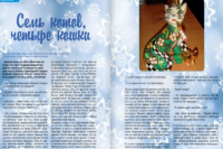 "Кошек" купил глянцевый журнал "Верные решения". Редактор заказал веселую, легкую, романтическую историю. Короче, старый, добрый жанр "рождественский рассказ". "Кошки" были изданы в новогоднем номере. Онлайн версия журнала: http://issuu.com/vr47/docs/vr1112/21 Читать по ссылке удобно, файл хорошо увеличивается.