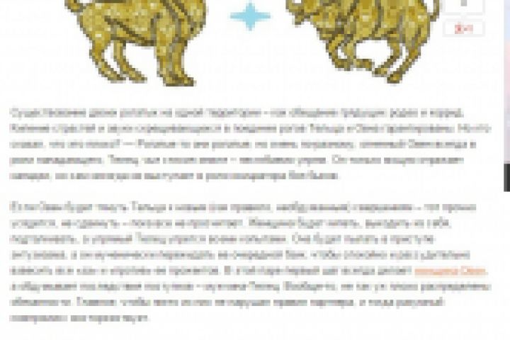 Существование двоих рогатых на одной территории – как обещание грядущих родео и коррид. Кипение страстей и звуки скрещивающихся в поединке рогов Тельца и Овна гарантированы. Но кто сказал, что это плохо? — Рогатые то они рогатые, но очень по-разному; огненный Овен всегда в роли нападающего, Телец, чья стихия земля – несгибаемо упрям. Он только мощно отражает нападки, но сам никогда не выступает в роли инициатора боя быков.