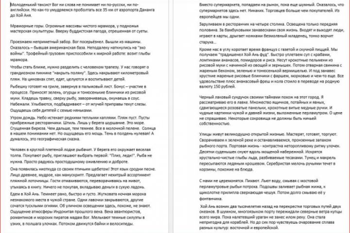 История одного путешествия. Вьетнам город Хой Ань, входящий в культурное наследие Юнеско. Статья для сайта о культуре и путешествиях. Требовалось написать текст-впечатление, а не традиционный туристический обзор. Жаль, что только 5000 знаков))). К тексту приложила собственные фото.