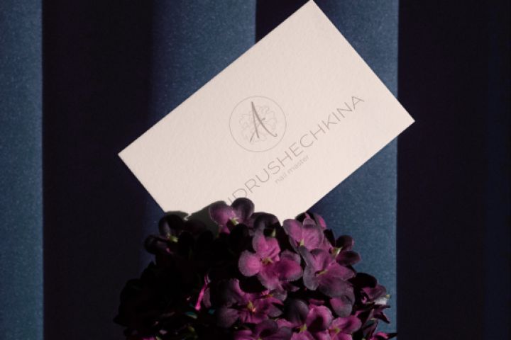 Двухсторонняя визитка в нежно розовом цвете с картой лояльности для мастера маникюра