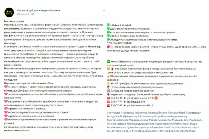 Пост Вконтакте "Фитнес-клуб для женщин"