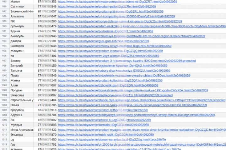 Парсер имен, номеров телефонов и ссылок на объявления для сервиса OLX