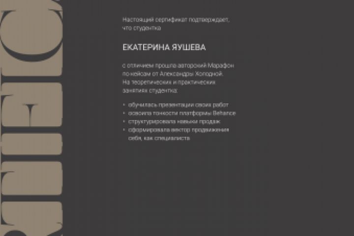 Сертификат от Александры Холодной о прохождении марафона по оформлению кейсов на Behance.