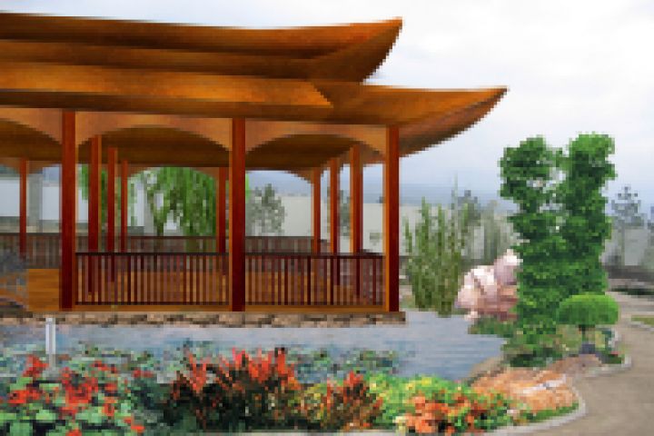 Беседка расположена над водоемом, поэтому для ее озеленения предложены водные и экзотические растения.