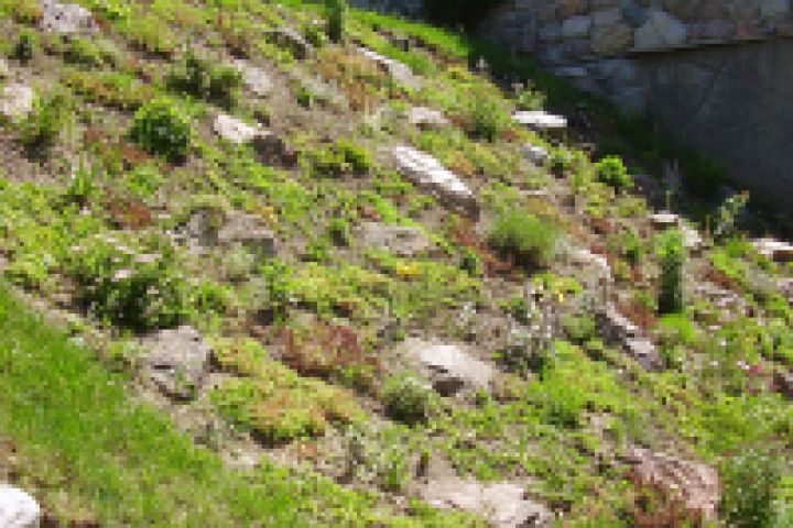 Оформление рельефного участка с помощью создания на естественном склоне рокария. В посадках использованы хвойные и лиственные стелющиеся кустарники, цветущие многолетки и почвопокровные растения.