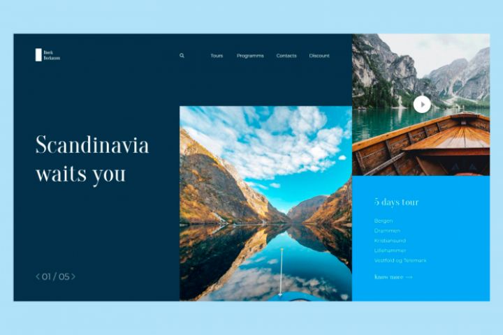 Концепт главного экрана для сайта туристической компании. Основа дизайна - фото мест, в которые предполагается путешествовать, и правильный подбор шрифтов для определенной темы.