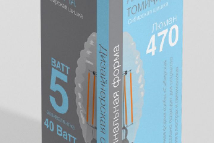 Дизайн упаковки для лампочки Томича «Сибирская шишка». Необходимо было разработать несколько видов упаковки в разных цветах, сделать развертку, подготовить макет к печати.