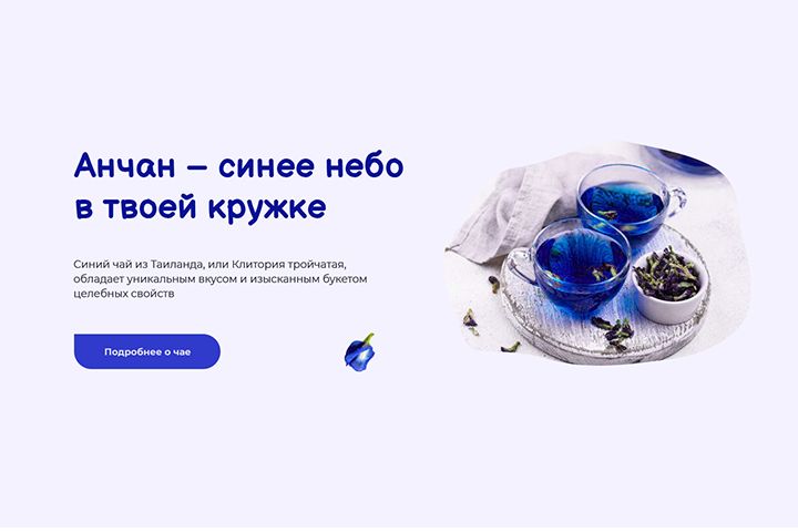 Landing page для продажи синего чая прямиком из Тайланда. Описаны полезные свойства чая, способ заваривания, а также отзывы покупателей.