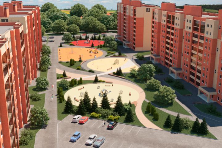 Концепция, проект благоустройства придомовой территории строящегося жилого комплекса, дорожки, зеленые насаждения, элементы благоустройства, игровые зоны и спортинвентарь.
