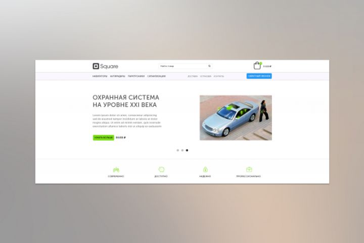 Данная разработка решала задачу создания лендинг-страницы интернет-магазина. Компания Square - розничный продавец автомобильных аксессуаров с акцентом на электронике (сигнализации, антирадары, и прочая). Square делает упор на гарантированное качество реализуемых товаров и работает только с уважаемыми поставщиками.