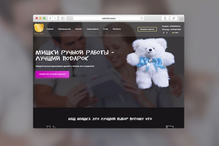 Создать сайт в темных тонах, которые отображают преимущества и все прелести покупки мишек данной модели. Необходимо было сделать дизайн и верстку, после чего отдать заказчику для реализации функционала.