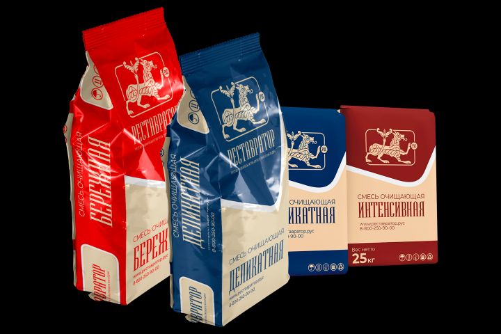 Нужно было сделать оригинальный логотип, полный фирменный стиль, брендбук, линейку из 16 упаковок реставрационных смесей и 2 сайта.