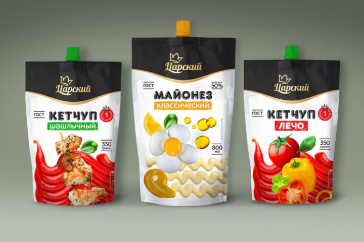 Разработка логотипа тм "Царский" и дизайн упаковки для линейки кетчупов и майонеза