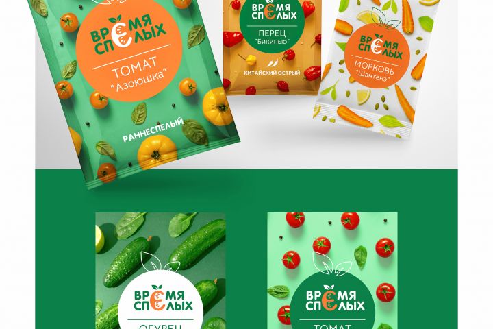 Задача - создать яркий, выделяющийся на полке, дизайн упаковки для семян "Время Спелых". Предварительно был разработан логотип.