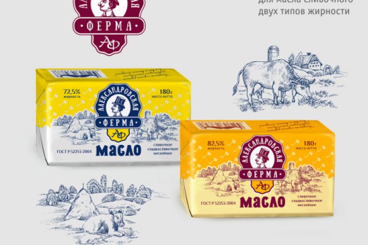 Разработка логотипа тм "Александровская Ферма". Дизайн упаковки для линейки продуктов - масло сливочное различной степени жирности.
