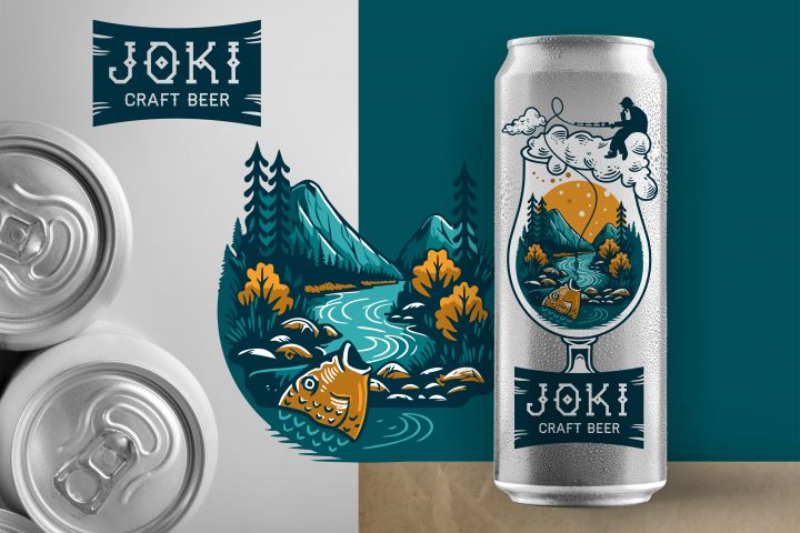Разработка логотипа Пивоварни крафтового пива "JOKI" (река), находящейся в Карелии. Пример нанесения фирменной айдентики на пивную банку 0,5 л. Проект не реализован, дизайн продается.