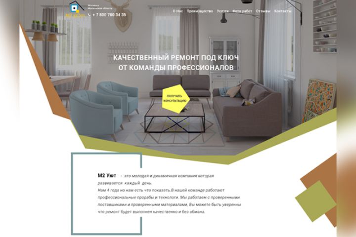 Разработка сайта в формате Landing page для компании М2уЮm, занимающаяся ремонтом под ключ в Москве и области. Работа выполнена по сетке, с всеми предпочтениями заказчика по дизайну. Верстка сайта выполнялась с использованием Bootstrap, js, jQuery, php, + Интеграция. С адаптацией.