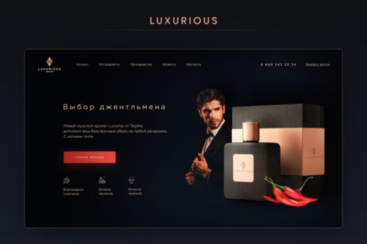 Дизайн первого экрана лендинга для мужского аромата "Luxurious"