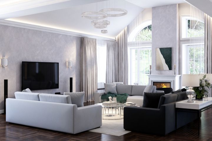 Дизайн кухни-гостиной в загородном доме, в стиле современной классики.
