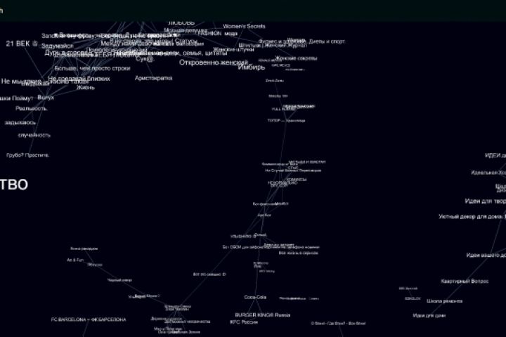 Это динамический 3Д граф, показывающий связь аудитории между 500 самыми популярными группами Вконтакте. Реализован на Vue-js и js.