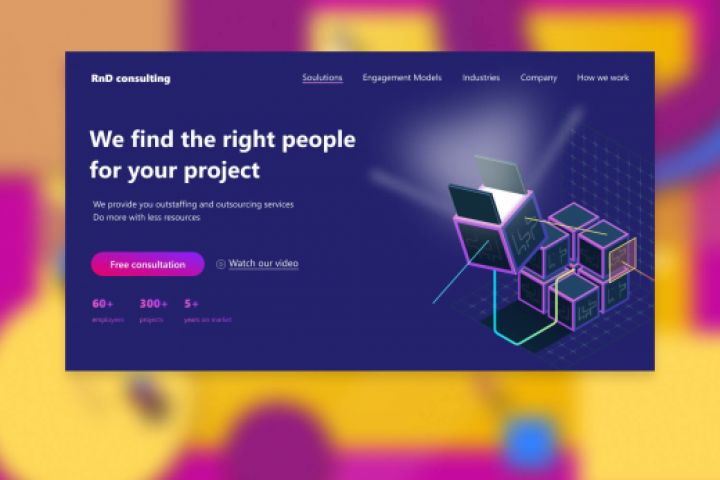Сайт IT компании, которая занимается outstaff и outsource. На первом экране видно акцент на важных цифрах, которые показывают опыт и компетенцию компании.