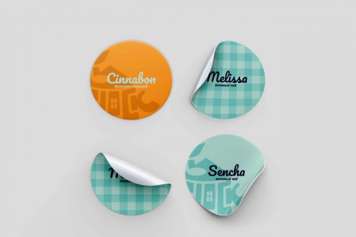 Наклейки выполнены в фирменном стиле, с использованием фирменного паттерна и логотипа, в фирменных цветах и с использованием фирменных шрифтов