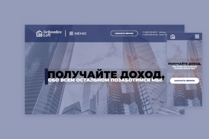 Разработка дизайна официального сайта компании Griboedov Loft. Общий объём страниц составил 26 штук + адаптивные макеты под мобильные устройства.