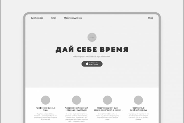 Посадочная страница для мобильного приложения по медитации. Полный прототип во вложении.
