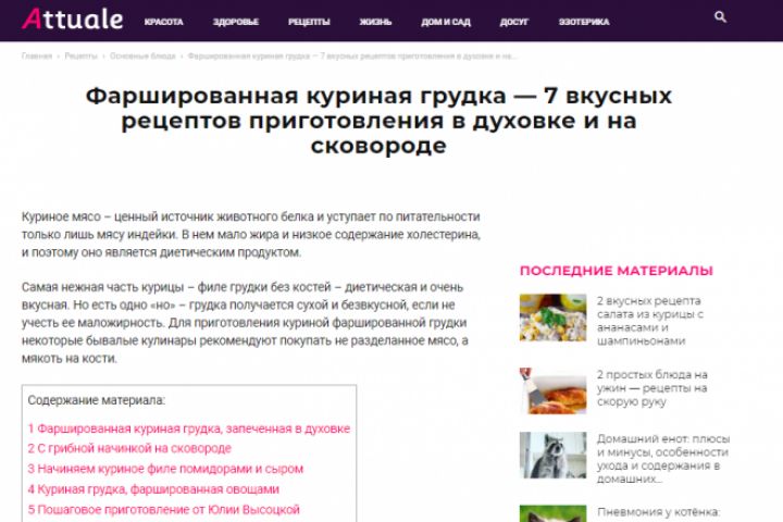 Статью про фарширование куриной грудки я писала для заказчицы информационно-развлекательного сайта Attuale.ru. Она очень торопила и давала мало времени для написания. Но написание статьи далось легко и текст получился довольно объемный и неоднообразный. Рецепты хорошо проструктурированы, читабельны и легки в приготовлении. В этой работе я показала понимание темы и своей целевой аудитории.