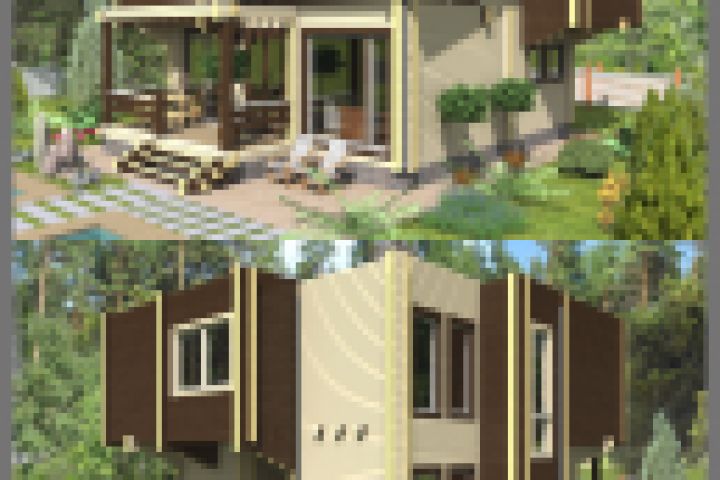 Брусовый дом в стиле хай-тек. Габариты 10,5х11,5 м. Общая площадь 117,8 м кв. Кухня-гостиная со вторым светом над зоной гостиной, гостевая спальня, котельная, с/у, терраса на первом этаже. На втором этаже три спальни, обходная галерея и с/у.