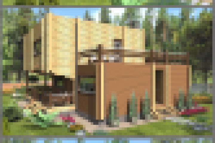 Брусовый дом в стиле хай-тек. Объем здания образован двумя параллелепипедами квадратными в плане, смещенными по диагонали. За счет смещения на первом этаже получилась большая крытая терраса, а на втором - обширный балкон для отдыха. Габариты 10.5х11.75 м. Общая площадь 178,1 м кв. Кухня-гостиная, гостевая спальня, котельная, с/у на первом этаже. На втором этаже три спальни и с/у.