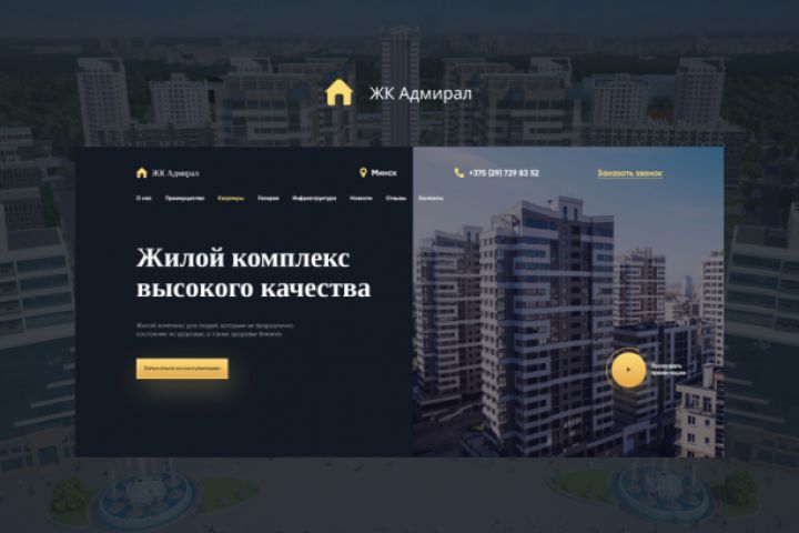 Задача заключалась в том, чтобы создать лендинг для компании, которая занимается продажей квартир в элитном жилом комплексе “Адмирал”. Главная цель лендинга - показать данный жилой комплекс, его внешний вид, преимущества, квартиры, подъезд и т.д. Целевое действие - запись на просмотр квартиры. Лендинг нужно было сделать в минималистичном стиле, показать только самое основное, без лишней воды.
