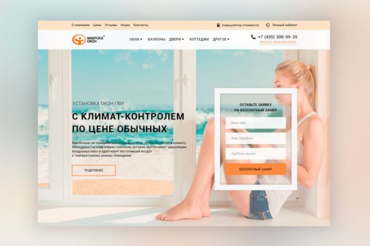 Дизайн главного экрана компании по продаже и установке пластиковых окон выполнен в теплых, светлых тонах для создания чувства уюта и комфорта. Окно обратной связи на макете представляет собой элемент скевоморфизма, но общая стилистика соответствует flat-дизайну.