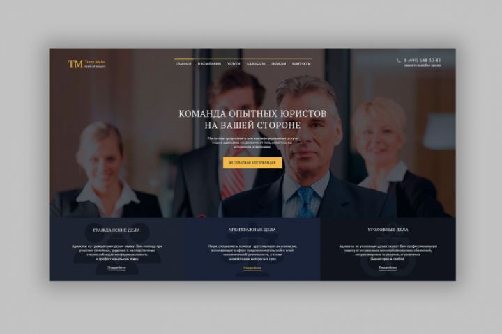 Дизайн сайта юридической фирмы, предоставляющей услуги адвокатов по гражданским, уголовным и арбитражным делам. Эта работа совмещает современный дизайн с предоставлением максимально полной информацией, которая может волновать клиента, и поддержкой обратной связи.