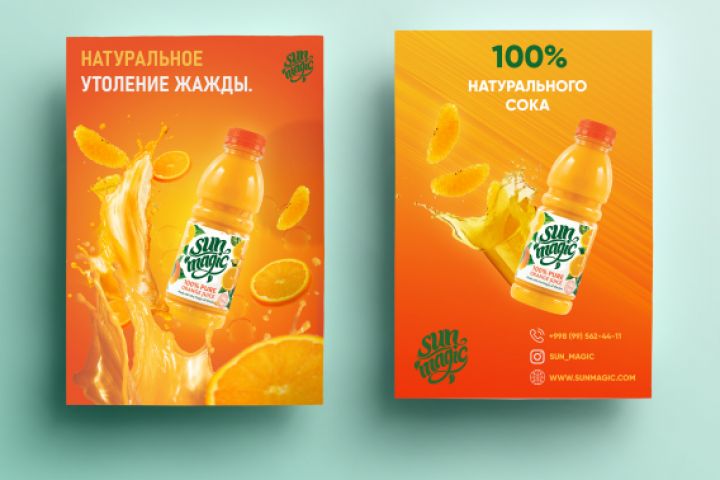 Дизайн для компании по производству апельсинового сока выполненный в ярких светло-оранжевых оттенках.