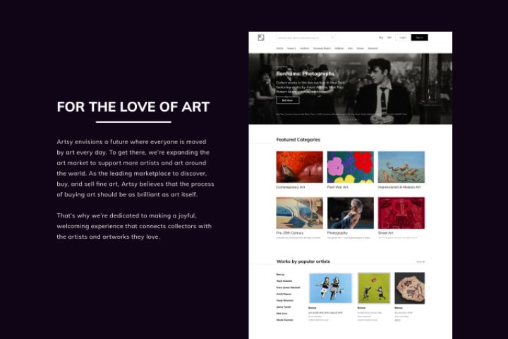 Artsy предвидит будущее, в котором каждый день будет увлечен искусством. Чтобы достичь этого, мы расширяем рынок искусства, чтобы поддержать больше художников и искусства по всему миру. Будучи ведущим рынком для открытия, покупки и продажи изобразительного искусства, Artsy считает, что процесс покупки искусства должен быть таким же блестящим, как и само искусство.