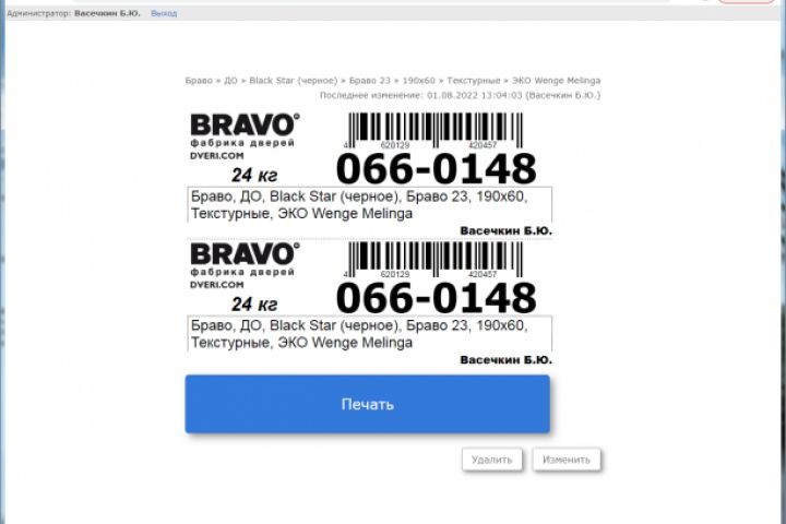 После появились доработки, в виде формирования этикетки со штрих кодом "на лету" и добавления ФИО на печатаемую этикетку, печать сразу 2-ух экземпляров и сброс авторизации после печати или отмены печати.