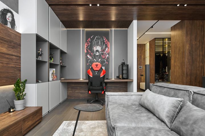 Задача не самая простая, объединить все это. Но за счет того, что все сделано гармонично по цветам, материалам и освещению, мы не чувствуем каши или захламления. И находиться там крайне уютно и комфортно!